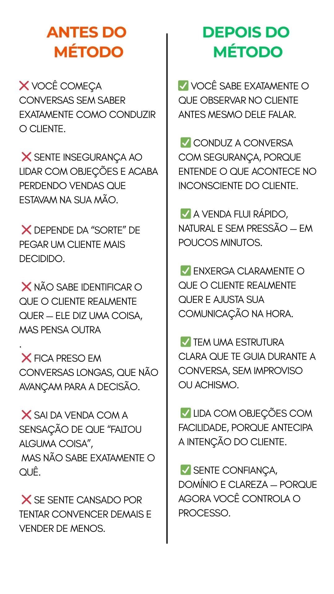 O método integra princípios de neurociência, psicologia aplicada e técnicas avançadas de vendas, permitindo que qualquer pessoa desenvolva uma abordagem mais estratégica e eficaz na hora de influenciar, comunicar e vender.